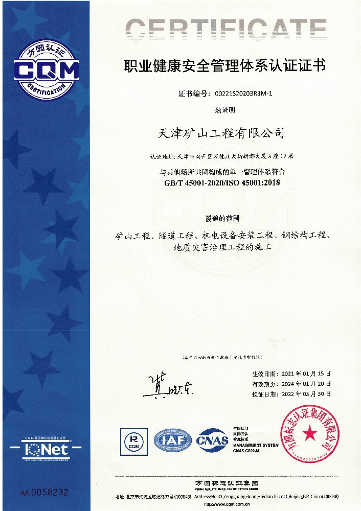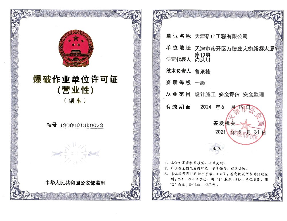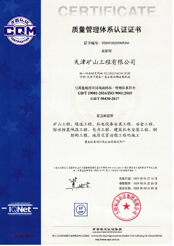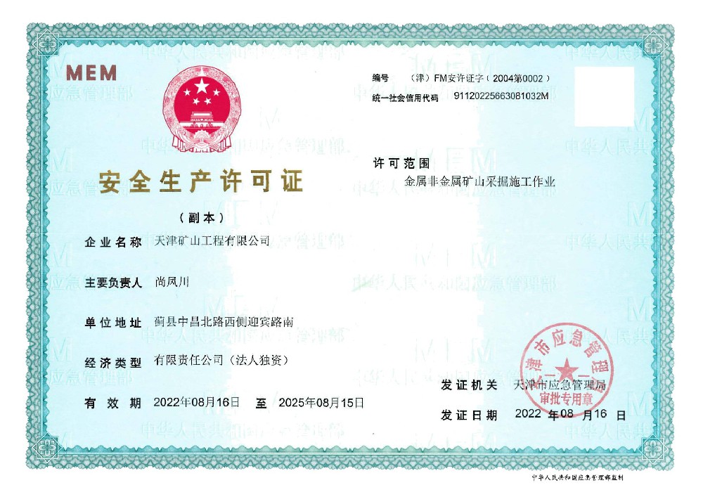 天津礦山工程有限公司(以下簡稱公司)始建于1965年,隸屬中國建材集團(tuán)有限公司,是從事礦山總承包、礦山開采運(yùn)營、礦山設(shè)計(jì)與咨詢、土石方爆破、生態(tài)恢復(fù)治理、鋼結(jié)構(gòu)制作安裝、機(jī)電設(shè)備安裝以及工程測量的專業(yè)化礦山施工企業(yè)和礦山開采運(yùn)營總承包服務(wù)商。具備礦山總承包和爆破雙一級資質(zhì)。 公司始建于1965年,總部位于天津市···
